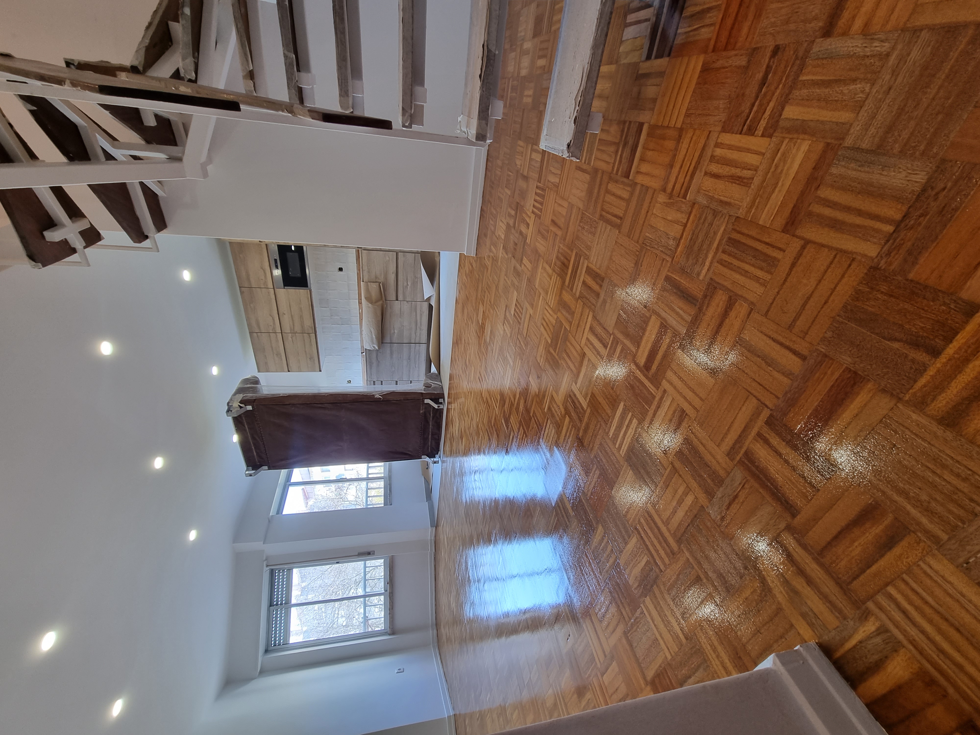 Nesta obra colamos os tacos soltos, foi feito o afagamento, a betumagem das juntas e o envernizamento com 3 de mãos de verniz meio-brilho.